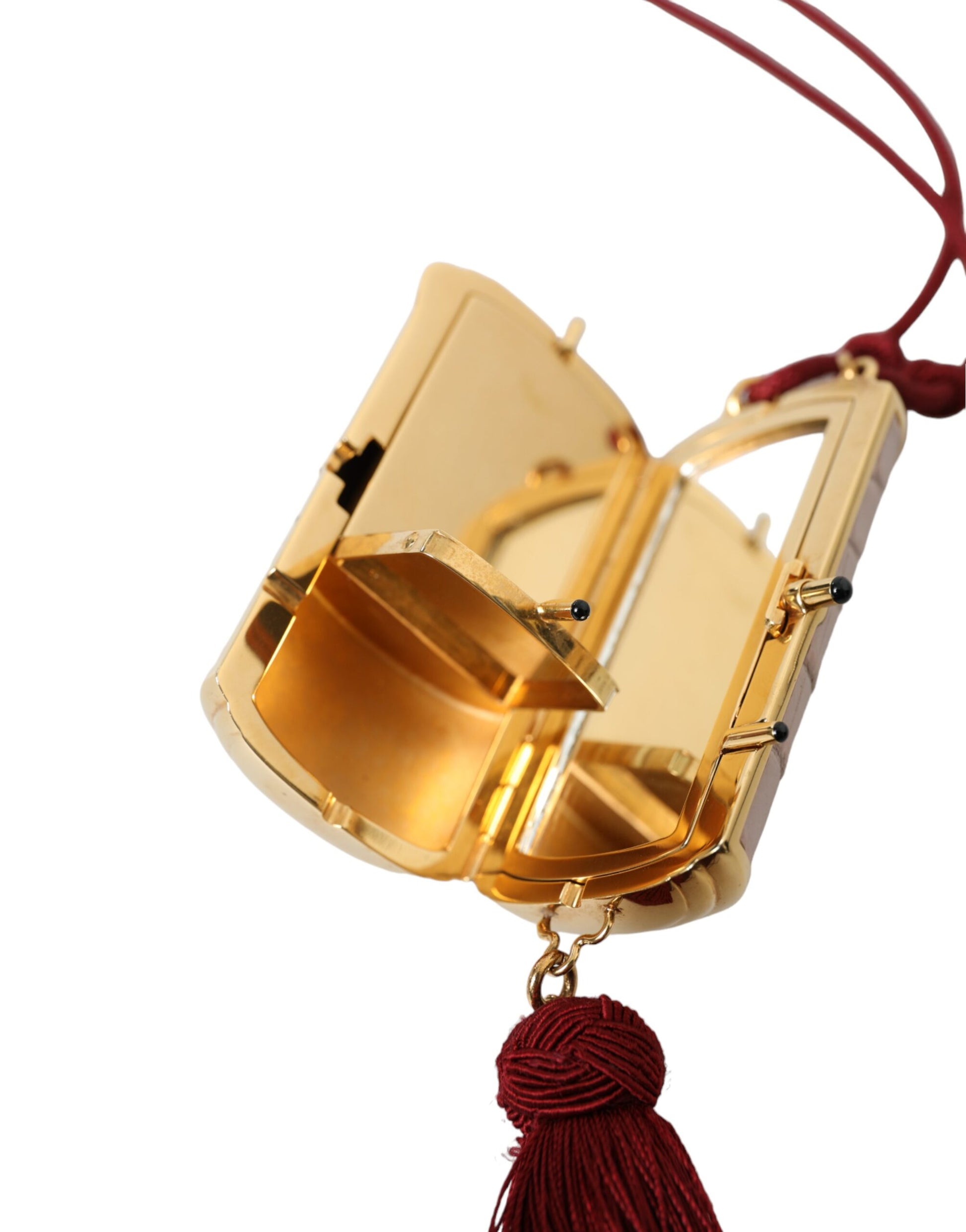 حزام رقبة بتصميم مرآة صغيرة رائع وجديد تمامًا، أصلي 100% من دولتشي آند غابانا. نموذج: حقيبة مرآة أحمر الشفاه المكياج المواد: 100٪ جلد غريب اللون: وردي مع تفاصيل معدنية ذهبية الحزام: حزام الرقبة بطانة داخلية ذهبية إغلاق المشبك تفاصيل الشعار، أجزاء معدنية محفورة عليها الشعار صنع في إيطاليا حصرية للغاية وحرفية عالية جدًا القياسات: 8 سم × 5 سم × 3 سم الحزام: 55 سم × 1 سم