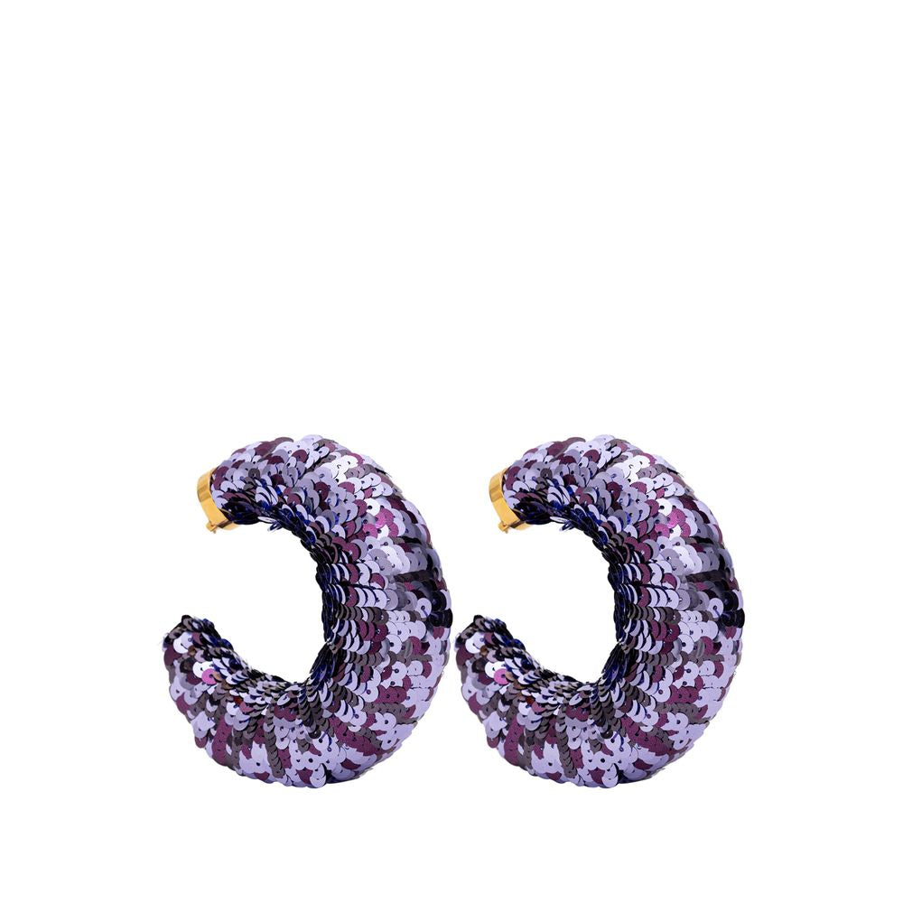 أقراط توم فورد كرواسون دائرية مرصعة بالترتر. لونها بنفسجي، هيكلها خفيف ومغطى بالترتر، مزودة بمشبك من النحاس المطلي بالذهب عيار ١٨ قيراطًا، وخالية من النيكل.