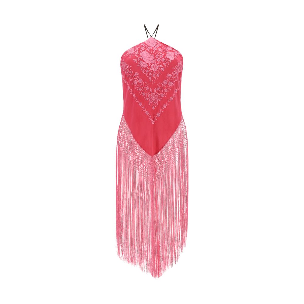 Silk Shawl Piano Top by Conner Ives, off-shoulder design, American-style front neckline, long fringe appliqué at top hem, asymmetrical hem, embroidered floral pattern on front and back.