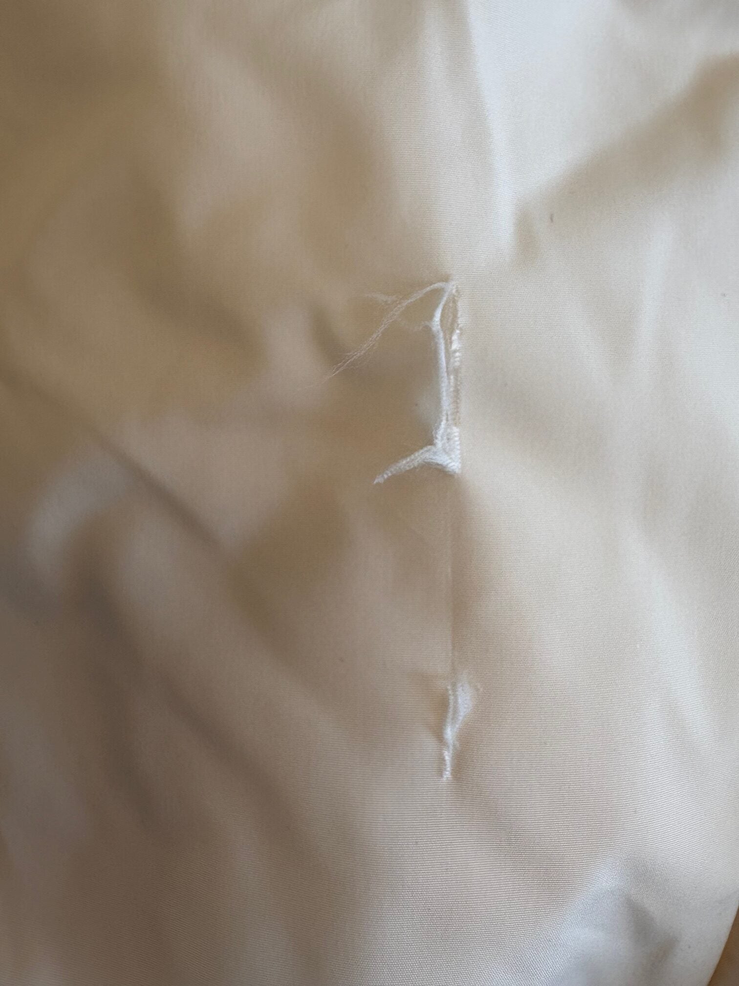 This item has minor defect, it has a rip on the left sleeve.