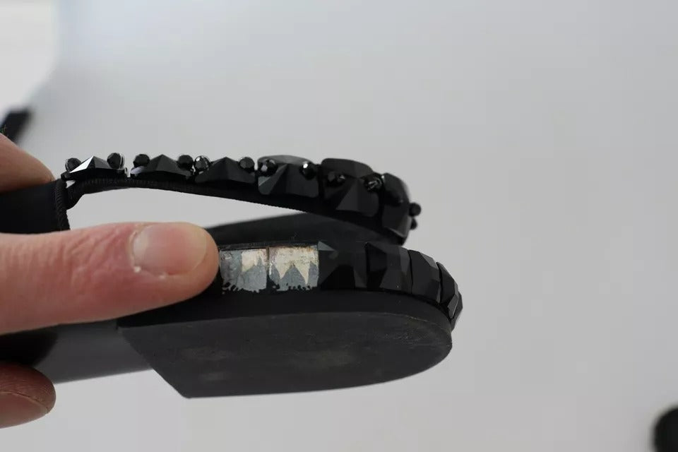 Dolce & Gabbana – Schwarze flache Slingback-Schuhe aus Charmeuse mit Kristallen