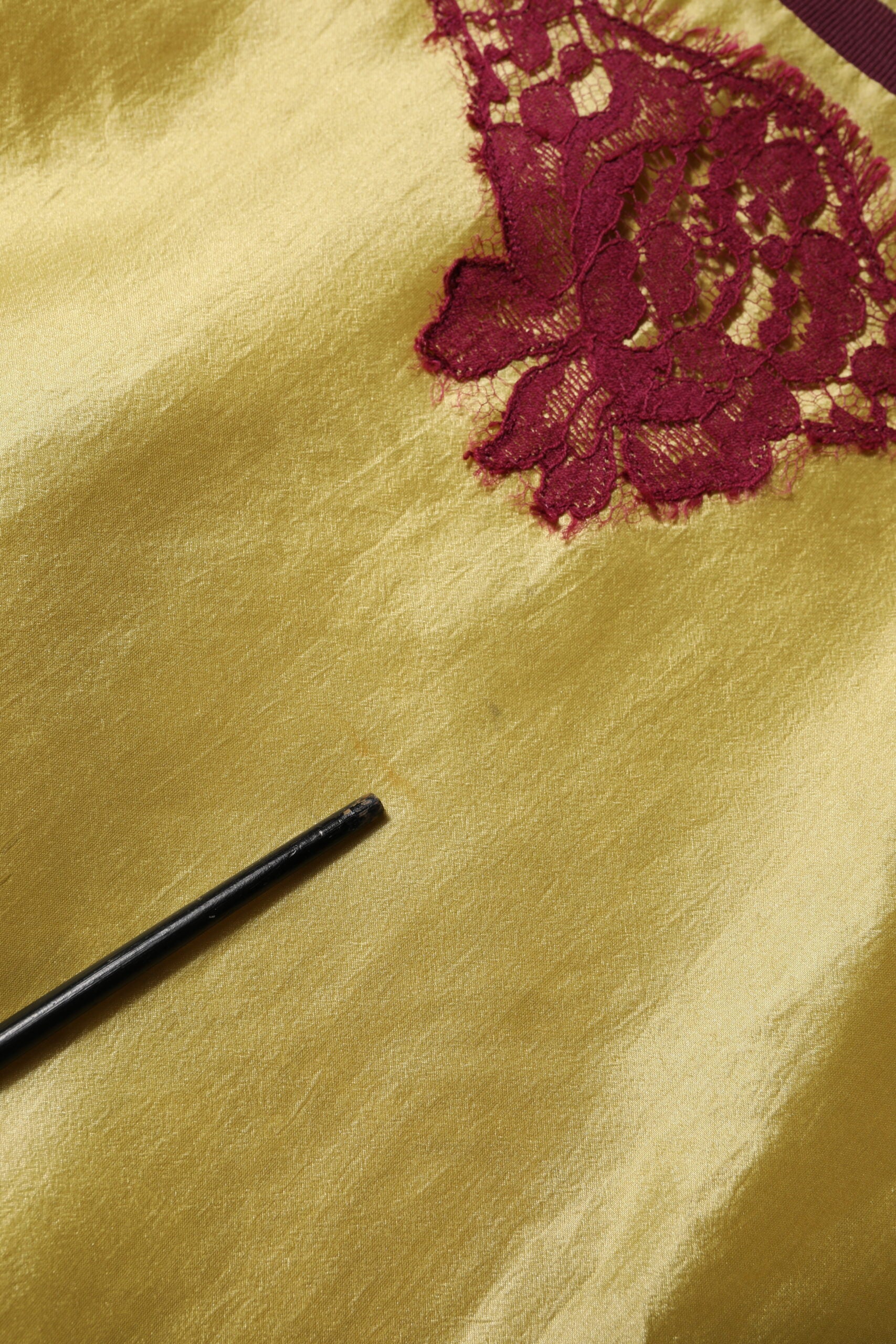 Das Top ist aus glänzendem gelbem Seidensatin gefertigt und strahlt Luxus und Raffinesse aus. Mit zarten floralen Spitzendetails und kurzen Ärmeln bietet es einen femininen und raffinierten Look. Perfekt zu maßgeschneiderten Hosen oder Röcken passt dieses Stück zu jedem Ensemble und verleiht jedem Outfit einen Hauch romantischer Eleganz.