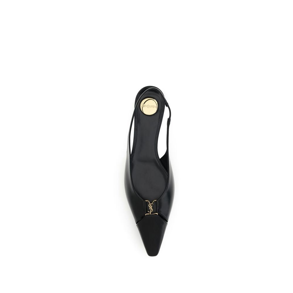 Die Babylon Ballerinas von Saint Laurent interpretieren klassische Eleganz mit einem unverwechselbaren modernen Touch neu. Die hinten offene Ballerinas zeichnen sich durch eine verlängerte, ausgeschnittene Zehenpartie aus, die mit dem ikonischen CASSANDRE-Schriftzug aus bronzefarbenem Metall verziert ist. Der elastische Riemen sorgt für einen bequemen und festen Sitz, während die runde Saint Laurent-Plakette auf der Innensohle ein raffiniertes und unverwechselbares Detail darstellt. Perfekt für einen schicken, lässigen Look.