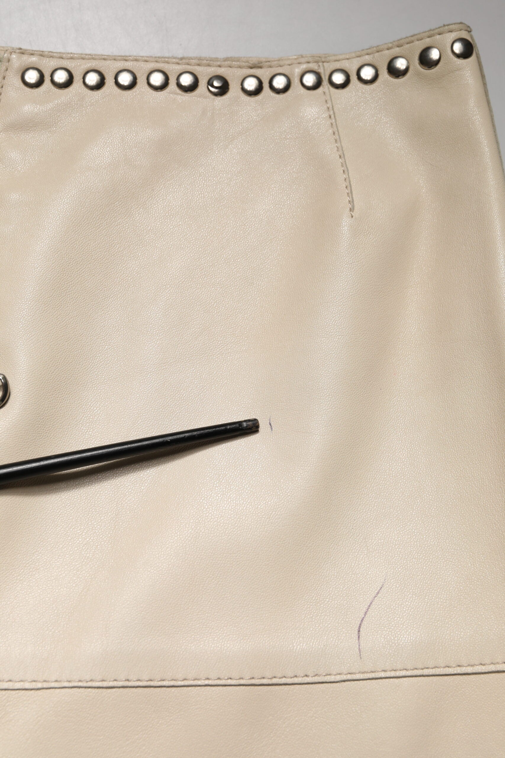 mini skirt is crafted from supple beige leather and embellished with metallic studs. The mid-waist design adds a modern edge, combining sophistication with a touch of rock-chic flair.