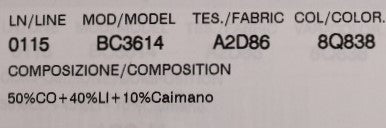 Material : 50 % Baumwolle, 10 % Cayman-Leder, 40 % Leinen
